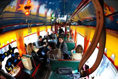 Der Ebbelwei-Express dreht in Frankfurt wieder seine Runden. Die Straßenbahn, in der Apfelwein und andere Getränke während der Fahrt ausgeschenkt werden, startete am Samstag erstmals seit März 2020 wieder zu einer Linienfahrt durch die Mainmetropole.