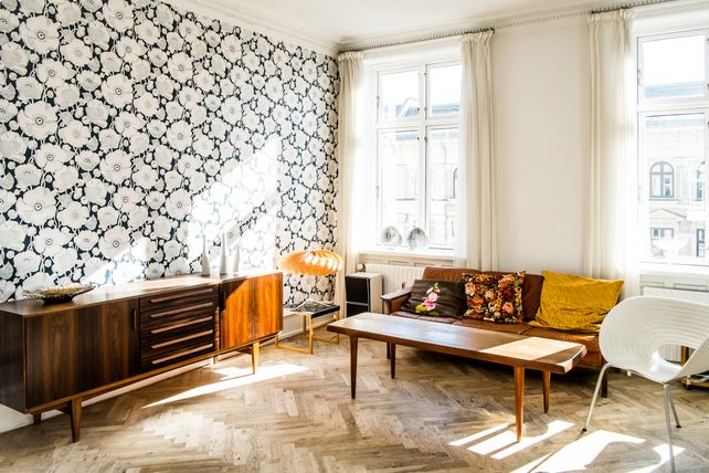 In dieser lichtdurchfluteten Wohnung in Kopenhagen könnten sich Gäste laut Mitteilung an herausragendem Design erfreuen. Besonderes Herzstück im Wohnbereich sei eine schwarz-weiße Tapete, die sich bei genauer Betrachtung zu einer grafischen Blumenwiese zusammenfüge.