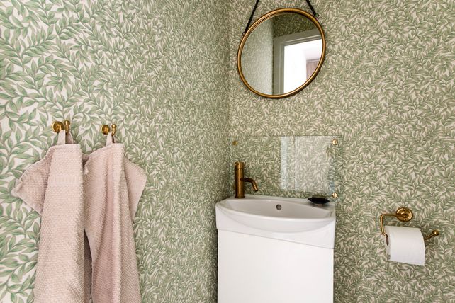 Mehr Wand-Design geht nicht: In diesem Boutique Home in Stockholm sei jeder Raum ein kleines Kunstwerk. So würden Gäste ihre Morgentoilette in einem Raum verrichten, der mit pastellfarbenen Blättern tapeziert sei. Doch auch Details wie beispielsweise Handtücher in Altrosa sowie Armaturen, Haken und Spiel in Gold würden sich natürlich einfügen.