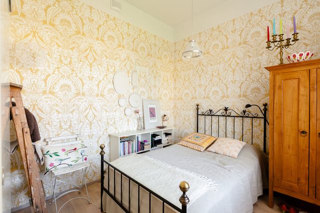 Diese zart gemusterte Tapete in weiß-gold bringe das sanfte Licht der Morgensonne ins Schlafzimmer, ist Airbnb überzeugt. Gäste dieser Unterkunft, die in der historischen Stadt Porvoo – vor den Toren Helsinkis – liegt, kämen in diesem warmen Setting ganz zur Ruhe.