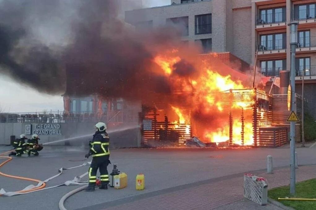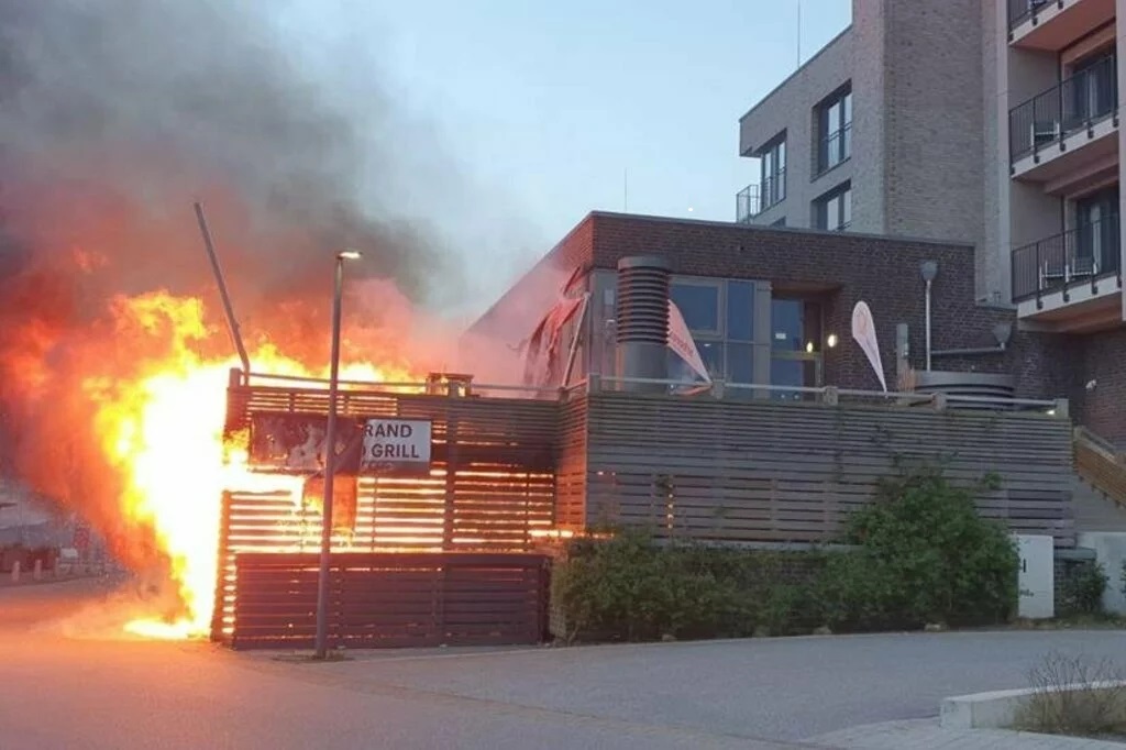 Um 20 Uhr sei die Feuerwehr durch eine ausgelöste Brandmeldeanlage alarmiert worden, teilte die Polizei Lübeck mit. Nur durch das schnelle Eingreifen der Freiwilligen Feuerwehr habe ein Übergreifen der Flammen auf den Gebäudekomplex verhindert werden können. „Durch die Hitzeentwicklung zerbarsten zwei Fensterscheiben des Restaurants. Außerdem wurden die Holzterrasse sowie der darunter befindliche Unterstand, der als Lagerraum für Müllbehältnisse fungiert, vollständig beschädigt, sodass Einsturzgefahr besteht“, so die Polizei. Der Sachschaden wird auf einen mittleren fünfstelligen Bereich geschätzt.