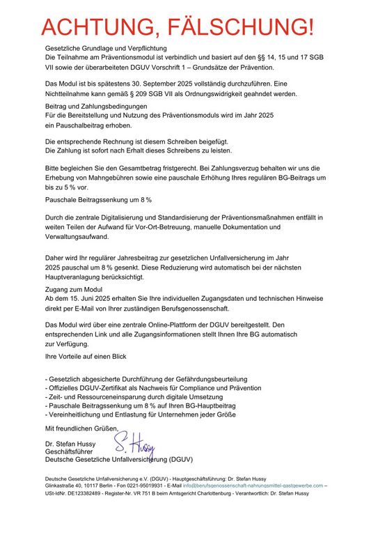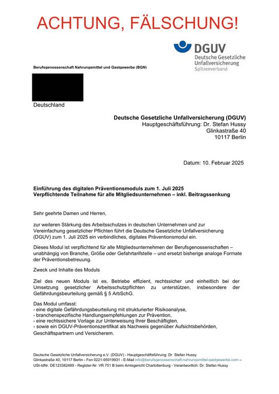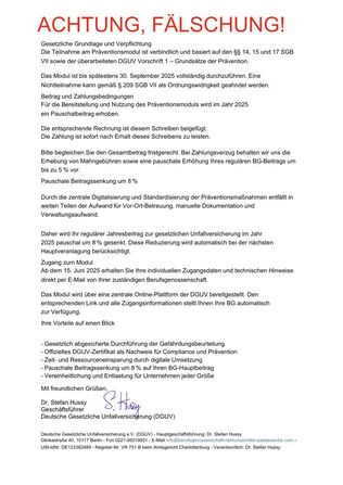 Seit vergangenem Wochenende sind nun auch Schreiben bzw. E-Mails mit dem Briefkopf der Deutschen Gesetzlichen Unfallversicherung e.V. (DGUV) im Umlauf, die mit dem Betreff „Einführung des digitalen Präventionsmoduls zum 1. Juli 2025, Verpflichtende Teilnahme für alle Mitgliedsunternehmen – inkl. Beitragssenkung“ versehen sind. Es gibt weder ein derartiges digitales Präventionsmodul, noch eine verpflichtende Teilnahme. Auch eine damit verbundene Beitragssenkung oder -erhöhung gibt es nicht.