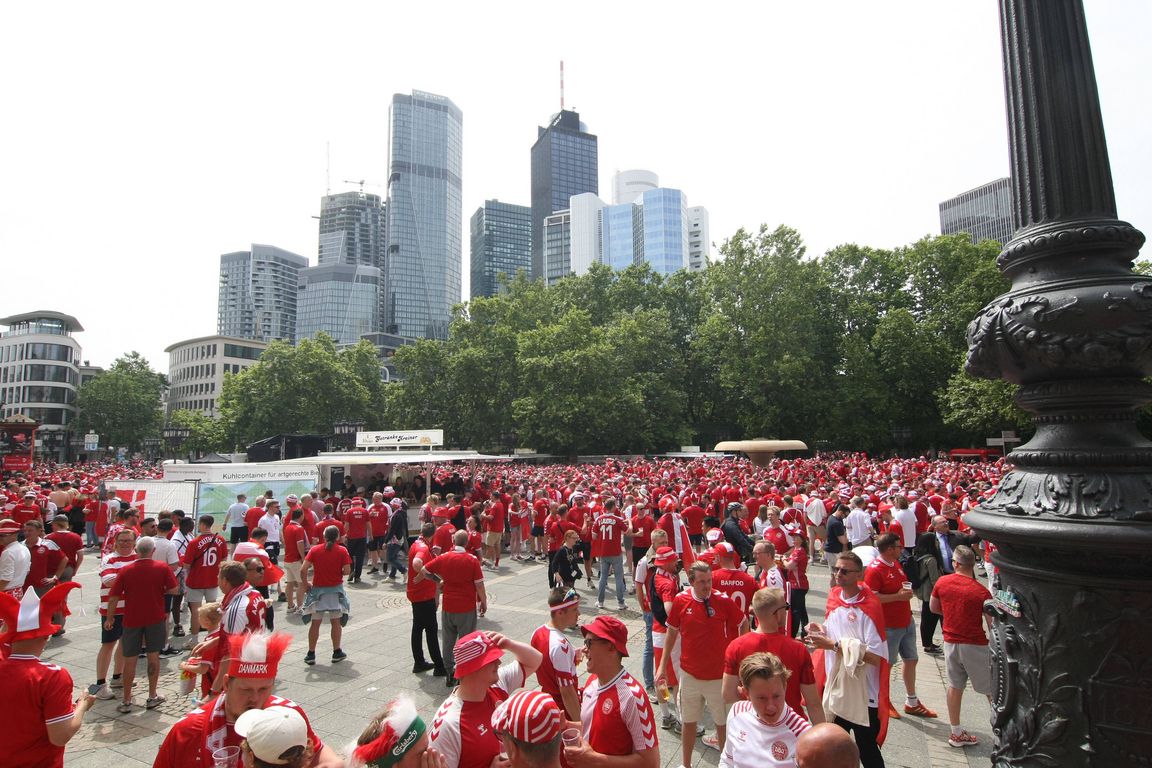 «Its's coming Home» und «Sweet Caroline»: Das Frankfurter Bahnhofsviertel wird vor dem Fußball-Europameisterschaftsspiel England gegen Dänemark zeitweilig zum Schauplatz eines großen Rudelsingens. Vor allem englische Fans grölen die Fußballhits bereits am Mittag lautstark mit. Fast jeder Pub, jede Kneipe oder Bar ist gefüllt mit Fans der beiden Mannschaften - eine ausgelassene Fußballparty im Herzen der Mainmetropole.