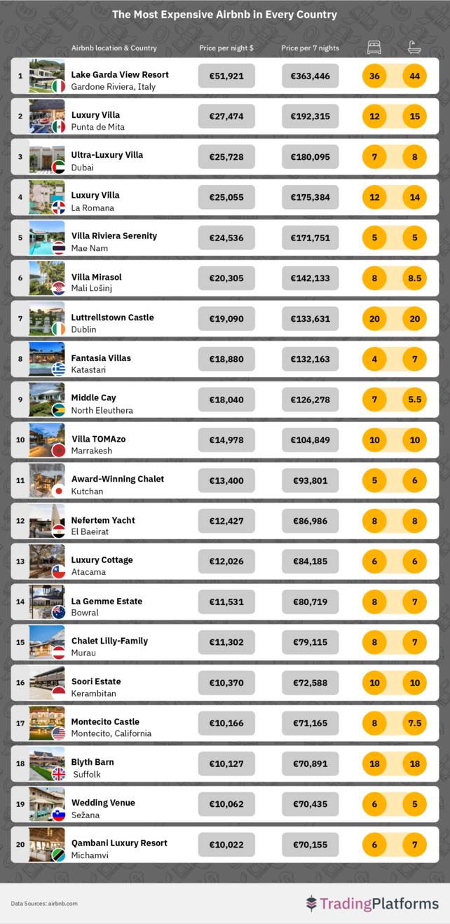 Eine neue Analyse von Tradingplatforms hat die weltweit teuersten Airbnb-Angebote für Januar 2026 ermittelt. Der Bericht, der sich auf die luxuriösesten Unterkünfte in 86 Ländern konzentriert, zeigt, dass eine Anlage am Gardasee in Italien mit einem Übernachtungspreis von 51.921 Euro pro Nacht die Liste anführt. Dahinter folgen Villen in Mexiko und Dubai.