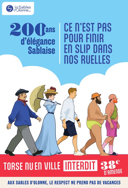 Mit einem Augenzwinkern wird auch auf einem Plakat für die Kleideretikette geworben. «Nach 200 Jahren Eleganz in Les Sables wollen wir doch nicht in Unterhosen in unseren Gassen enden!», steht über den Bildern von fünf unterschiedlich gekleideten Menschen, die quasi die Evolution der Badegäste zeigen sollen.