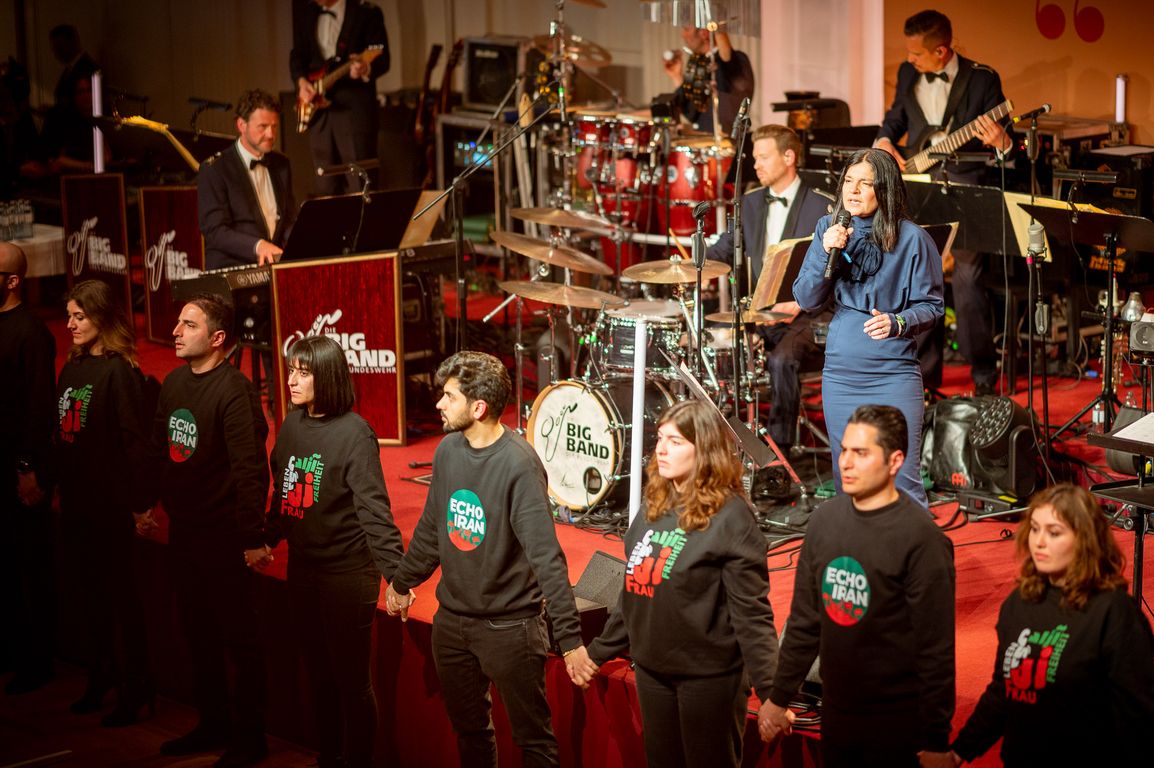 Nach dem Dinner tanzte Bundespräsident Steinmeier den offiziellen Eröffnungswalzer mit der Frau des Vorsitzenden der Bundespressekonferenz. Zuvor gab es einen weiteren emotionalen Aufruf und ein Lied für die Freiheit von der deutsch-iranischen Schauspielerin Jasmin Tabatabai. Sie sprach von einem «Kindermörder-Regime» im Iran und den sogenannten Revolutionsgarden als «Terrororganisation». Menschen würden verschleppt, vergewaltigt und brutal gefoltert. «Es zerreißt mir das Herz.» Umso wichtiger seien die Journalisten. «Die Wahrheit ist das, was das Regime am meisten fürchtet.» In Richtung von Außenministerin Baerbock sagte Tabatabai: «Ich bin Ihr Fan. Wenn Sie Unterstützung brauchen, ich bin da.»
