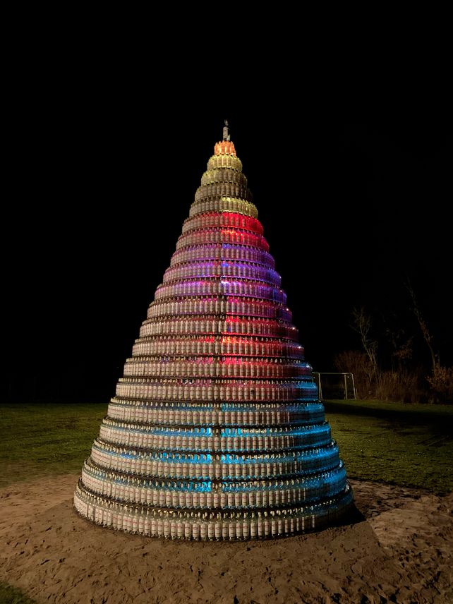 Für den Tannenbaum hat das Team aus Freunden, Nachbarn, Kollegen und Familien 0,7-Liter-Kornflaschen eines norddeutschen Unternehmens verbaut. Die Flaschen hatten sie vorher bei Gastwirtschaften und Zeltfesten in der Region eingesammelt. Die Spitze der Pyramide bildet eine Drei-Liter-Kornflasche. Eine ähnliche Aktion hatte vor einem Jahr eine Gemeinde in Nordbayern auf die Beine gestellt. In Nordheim am Main (Franken) wurde aus 1099 bauchigen Weinflaschen und einer Jubiläumssektflasche ein grüner Weihnachtsbaum gebaut.