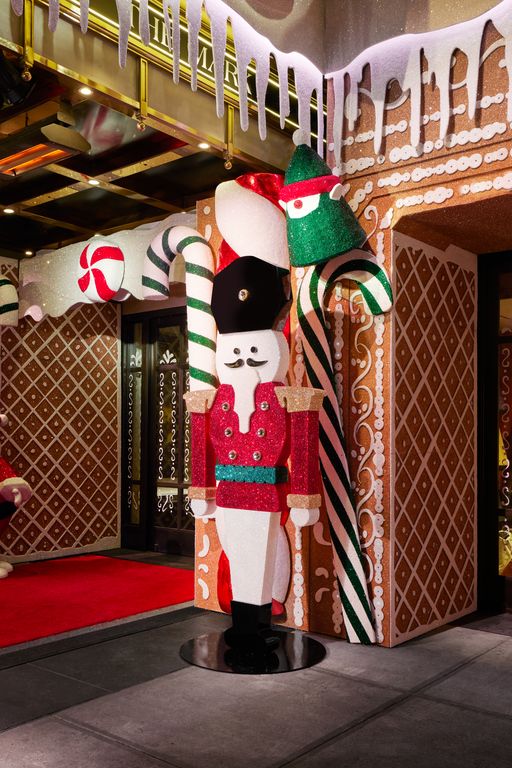 Die Fassade wurde innerhalb einer Woche gebaut und installiert und besteht aus Millionen von braunen Swarovski-Kristallen, mit einem Dach aus handgeformtem und kristallbestäubtem Fiberglas als Glasur. Riesige Zuckerstangen und eine Schleife umrahmen den Eingang, während riesige Nussknacker in Uniform Wache stehen. Das festliche Thema setzt sich in der Hotellobby mit einem glitzernden Weihnachtsbaum fort, der mit Kristallornamenten, Lebkuchenmännern, Schaukelpferden, Nussknackern, Sternen und Zuckerstangen geschmückt ist.