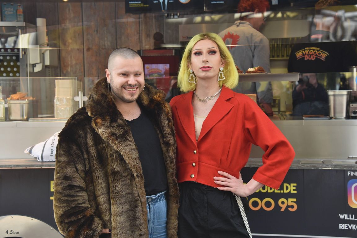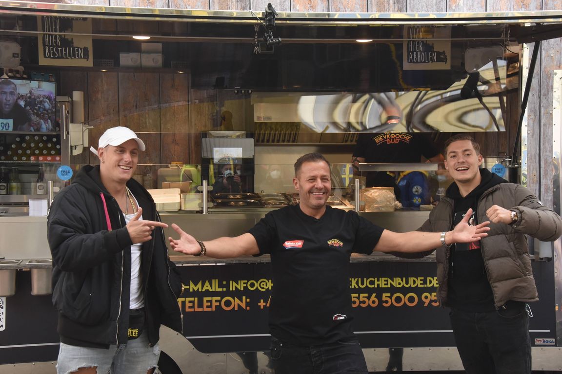So bauen sich vor dem Reibekuchen-Büdchen plötzlich etwas verloren Tim Stammberger, Serkan Yavuz und Chris Broy auf. Yavuz und Stammberger balzten mal in dem Format «Die Bachelorette» um eine Frau und sind seitdem Teil der Maschinerie. Broy geriet mit seiner Partnerin Eva mal in ein gemeines Ränkespiel in der RTL-Show «Das Sommerhaus der Stars». Wenig später betritt Aurelio Savina den Parkplatz, der mal im «Dschungelcamp» saß und nun eine Frau im Arm hält. Laut Einladung haben er und Freundin Larissa die Reibekuchen-Buden-Eröffnung zum ersten «gemeinsamen öffentlichen Auftritt» auserkoren.
