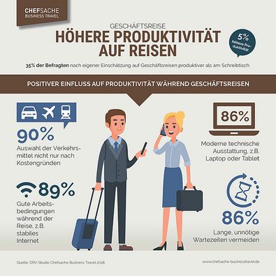 Eine Geschäftsreise ist verschwendete Arbeitszeit? Mitnichten. 35 Prozent der Mitarbeiter sind nach eigener Einschätzung unterwegs sogar produktiver als am Schreibtisch. Dazu tragen, laut der aktuellen Umfrage „Chefsache Business Travel 2018“, vor allem die Wahl des Verkehrsmittels und die Arbeitsbedingungen während der Reise bei.