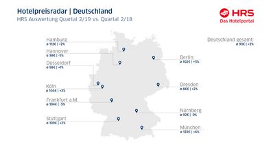Die Hotelpreise haben sich im zweiten Quartal in Deutschland positiv entwickelt. Das ergab die vierteljährliche Preisanalyse von HRS. Die durchschnittlichen Preise stiegen in diesem Quartal um zwei Prozent auf 93 EUR im Vergleich zum selben Vorjahreszeitraum. Den größten Sprung machte München um sechs Prozent (122 EUR).