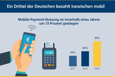 Mobile Payment setzt sich immer stärker durch. Die Zahl der Nutzer in Deutschland ist im Vergleich zum Vorjahr kräftig gestiegen. 33 Prozent zahlen mittlerweile kontaktlos per Bank- oder Kreditkarte sowie mittels Smartphone oder -watch. Im vergangenen Jahr war es erst jeder Fünfte.