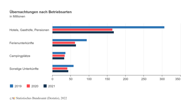 Die Zahl der Übernachtungen von Gästen aus dem Inland stieg im Jahr 2021 gegenüber dem Vorjahr um 3,3 Prozent auf 279,3 Millionen. Die Zahl der Übernachtungen von Gästen aus dem Ausland war mit 31,0 Millionen jedoch 3,1 Prozent geringer als 2020. Der Anteil ausländischer Gäste am gesamten Gästeaufkommen erreichte im vergangenen Jahr lediglich 10,0 Prozent gegenüber 10,6 Prozent im Jahr 2020 und 18,1 Prozent im Rekordjahr 2019. Die Ergebnisse belegen, dass die weltweiten Auswirkungen der Corona-Pandemie auf den internationalen Tourismus auch in Deutschland deutlich zu spüren sind.