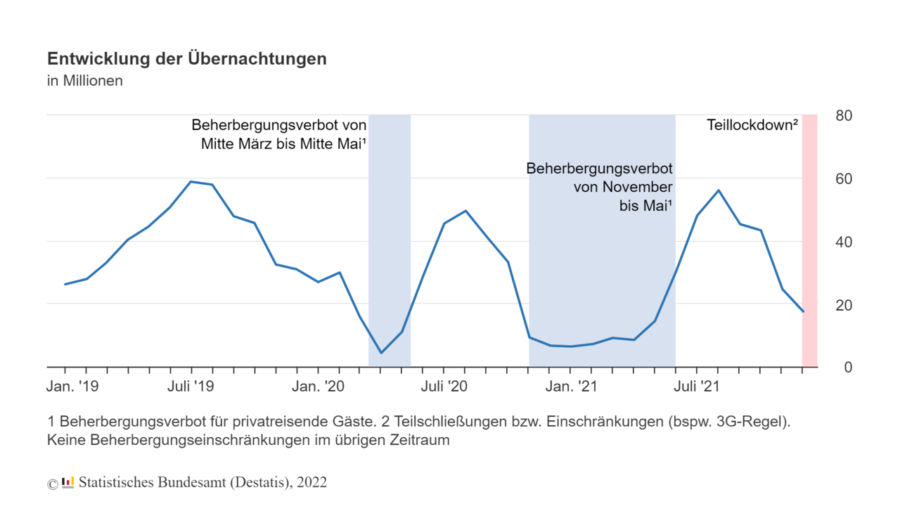 Offizielle Zahlen zeigen, wie die Tourismusbranche in Deutschland auch im Jahr 2021 erheblich unter der Corona-Krise gelitten. Wie das Statistische Bundesamt (Destatis) nach vorläufigen Ergebnissen mitteilt, verzeichneten die Beherbergungsbetriebe in Deutschland demnach im vergangenen Jahr 310,3 Millionen Gästeübernachtungen. Das waren 2,7 Prozent Übernachtungen mehr als im Jahr 2020, aber noch 37,4 Prozent weniger als im Vorkrisenjahr 2019. Im Dezember 2021 verbuchten die Beherbergungsbetriebe mehr als zweieinhalb Mal so viele Gästeübernachtungen gegenüber dem Dezember 2020, als ein bundesweites Beherbergungsverbot für private Übernachtungen galt.