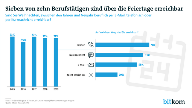 Das ist das Ergebnis einer repräsentativen Umfrage im Auftrag des Digitalverbands Bitkom unter 1.003 Bundesbürgern ab 16 Jahren, darunter 430 Berufstätige, die Urlaub haben. Demnach ist die Mehrheit vor allem telefonisch erreichbar (71 Prozent), 63 Prozent per Kurznachricht wie SMS oder Whatsapp. Mehr als jeder Zweite (55 Prozent) checkt außerdem seine beruflichen E-Mails. 2018 bewegte sich die Zahl derjenigen, die im Weihnachtsurlaub dienstlich erreichbar sind, mit 71 Prozent auf dem gleichen Niveau.
