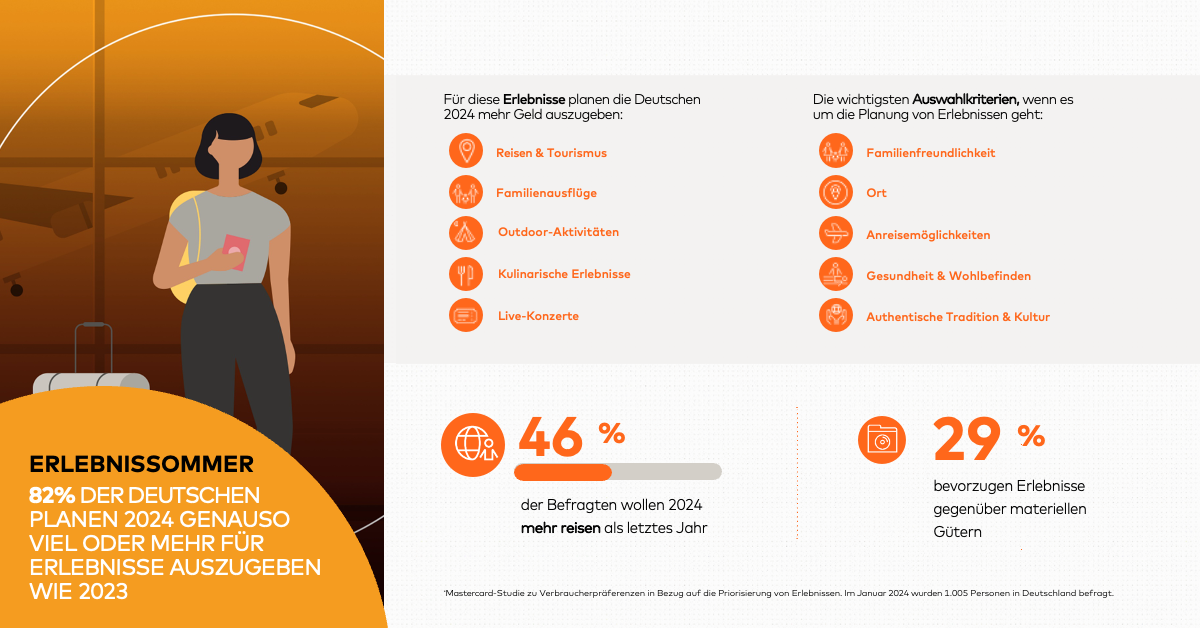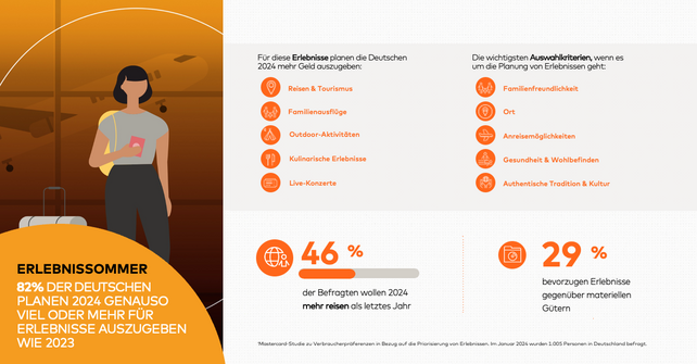 Das Jahr 2024 bietet zahlreiche sportliche Höhepunkte, viele Superstars gehen auf Tournee und Events sorgen für Furore. Auch bei Verbraucher:innen stehen solche Ereignisse hoch im Kurs. Wie eine neue Studie von Mastercard zeigt, planen 82 Prozent der Befragten in diesem Jahr genauso viel oder sogar mehr für Erlebnisse auszugeben als 2023.