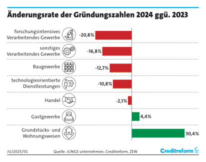 Hohe Energiekosten, Fachkräftemangel, Bürokratie, die unzureichende Digitalisierung der Verwaltung sowie ein zurückhaltendes Investitionsklima bremsen die Gründungsdynamik. Besonders stark betroffen sind Baugewerbe und verarbeitendes Gewerbe, wo die Zahl der Neugründungen 2024 deutlich zurückgegangen ist.
