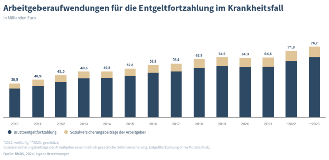 Im vergangenen Jahr 2023 mussten die Arbeitgeber 76,7 Milliarden Euro für die Entgeltfortzahlung ihrer erkrankten Beschäftigten aufbringen. Damit haben sich die Kosten binnen 14 Jahren verdoppelt. Der hohe Beschäftigungsstand, Lohnerhöhungen und nicht zuletzt der unverändert hohe Krankenstand lassen auch für das laufende Jahr keine Trendumkehr erwarten.