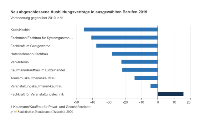 Die Zahl aller neu abgeschlossenen Ausbildungsverträge ist seit Jahren rückläufig. Während 2010 noch 559.000 Verträge abgeschlossen wurden, waren es 2019 nur noch 513.000. Insgesamt befanden sich am 31. Dezember 2019 rund 1,3 Millionen Personen in einer dualen Berufsausbildung, zehn Jahre zuvor waren es noch 1,5 Millionen (-11,9 Prozent).