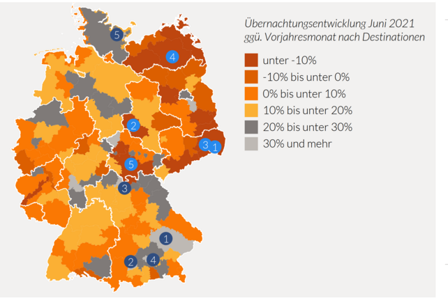 111 Regionen konnten die Übernachtungsverluste aus dem Vorjahr zumindest in Teilen wieder ausgleichen. In 31 Regionen sanken die Übernachtungen im Vergleich zum Juni 2020, eine Region hielt das Vorjahresergebnis.