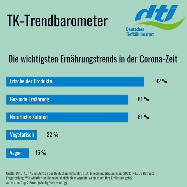 Praktisch jeder Haushalt (98 Prozent) kauft und nutzt Tiefkühlprodukte - schon in "normalen" Zeiten. In der Corona-Krise hat der Absatz tiefgekühlter Produkte im Lebensmittelhandel einen Boom erlebt: Er stieg 2020 im Lebensmittelhandel und den TK-Heimdiensten laut dti-Absatzstatistik um 12 Prozent. Der Anteil der "heavy-user", also der Verbraucher:innen, die TK mindestens ein- oder mehrmals im Monat bis zu mehrmals in der Woche verwenden, hat weiter zugenommen und liegt aktuell bei 78 Prozent. Die beliebtesten Warengruppen sind Gemüse/Kräuter (77 Prozent), Fisch (69 Prozent), Kartoffelprodukte (65 Prozent), Pizza (60 Prozent) und Brötchen (48 Prozent).
