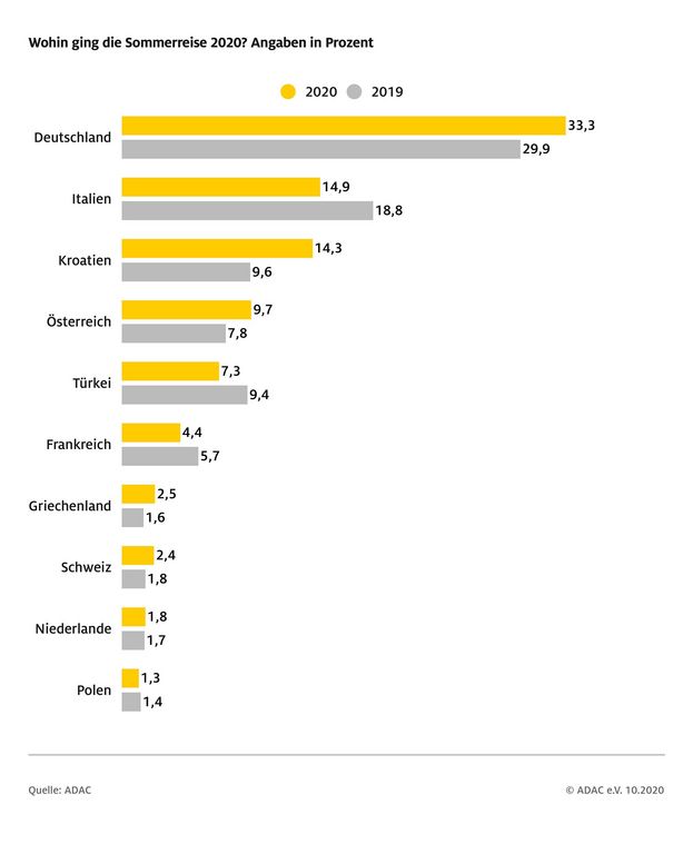 Viele Reisende haben sich für Urlaub im eigenen Land entschieden. Auf Platz eins der beliebtesten Urlaubsländer landet wie in den vergangenen Jahren Deutschland, legt mit 33,3 Prozent aber im Vergleich zum Vorjahr (29,9 Prozent) zu. Dahinter folgt Italien mit 14,9 Prozent, allerdings mit großen Verlusten. Kroatien verzeichnet die größten Zuwächse und landet mit 14,3 Prozent auf Platz drei. Spanien schafft es nicht mehr in die Top 10. Letztes Jahr lag es noch auf Platz sieben.