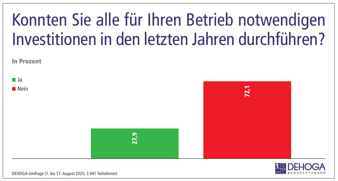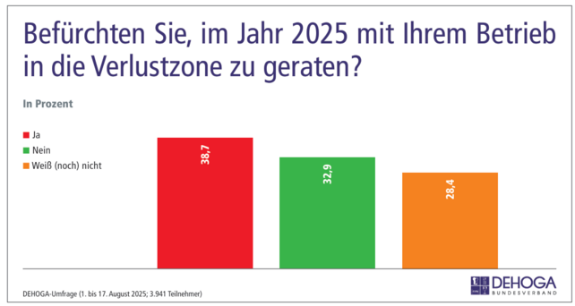 Wie ernst die Lage sei, zeige die aktuelle DEHOGA-Umfrage, an der sich knapp 4.000 Gastgeber aus ganz Deutschland beteiligt haben: Auf die Frage, ob sie befürchteten, im Jahr 2025 in die Verlustzone zu geraten, antworteten nur 32,9 Prozent der Betriebe mit „Nein“. Fast 40 Prozent der Unternehmer befürchten Verluste, 28,4 Prozent wissen es noch nicht.