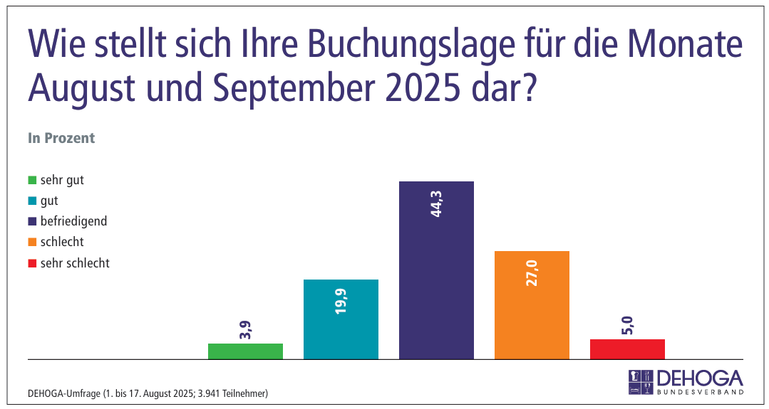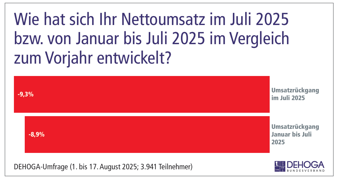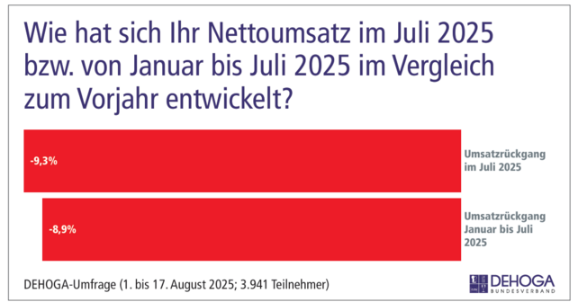 Das Gastgewerbe in Deutschland steht weiterhin unter massivem Druck. Nach aktuellen Daten des Statistischen Bundesamtes setzten die Hoteliers und Gastronomen nach vorläufigen Ergebnissen im ersten Halbjahr 2025 real 15,1 Prozent weniger um als im Jahr 2019, dem letzten Jahr vor der Coronakrise (nominal +10,9%, Originalwerte). Damit drohe dem Hotel- und Gaststättengewerbe das sechste Verlustjahr in Folge. Auch die jüngste Umfrage des Deutschen Hotel- und Gaststättenverbandes (DEHOGA Bundesverband) zur wirtschaftlichen Lage bestätigt die angespannte Situation: Im Juli 2025 meldeten die Betriebe im Schnitt Umsatzverluste von 9,3 Prozent gegenüber dem Vorjahr, im Zeitraum Januar bis Juli 2025 lag das Minus bei 8,9 Prozent. „Die Kosten explodieren, die Gäste sind preissensibler, die Umsätze sinken. Die aktuellen Belastungen bringen viele Betriebe an ihre Grenzen“, sagte DEHOGA-Präsident Guido Zöllick auf der Pressekonferenz des Verbandes am Dienstag in Berlin. „Jetzt ist entschlossenes politisches Handeln nötig – für starke Betriebe, sichere Jobs und echte Perspektiven.“