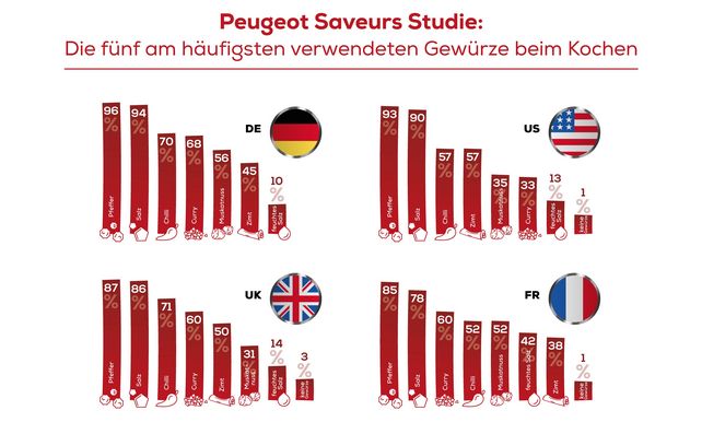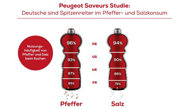 Eine vom Gewürzmühlenhersteller Peugeot Saveurs in Auftrag gegebene Studie zeigt, dass Deutsche im direkten Ländervergleich am häufigsten zu Salz und Pfeffer greifen, um ihr Essen zu würzen. Im Gegensatz zu den Befragten aus anderen Ländern mahlen die Deutschen ihren Pfeffer mit knapper Mehrheit am liebsten frisch. Neben Salz und Pfeffer gehören Chilli, Curry, Muskatnuss, Zimt sowie Feuchtsalz zu den Gewürzen, die sich in den deutschen Küchen am häufigsten wiederfinden.