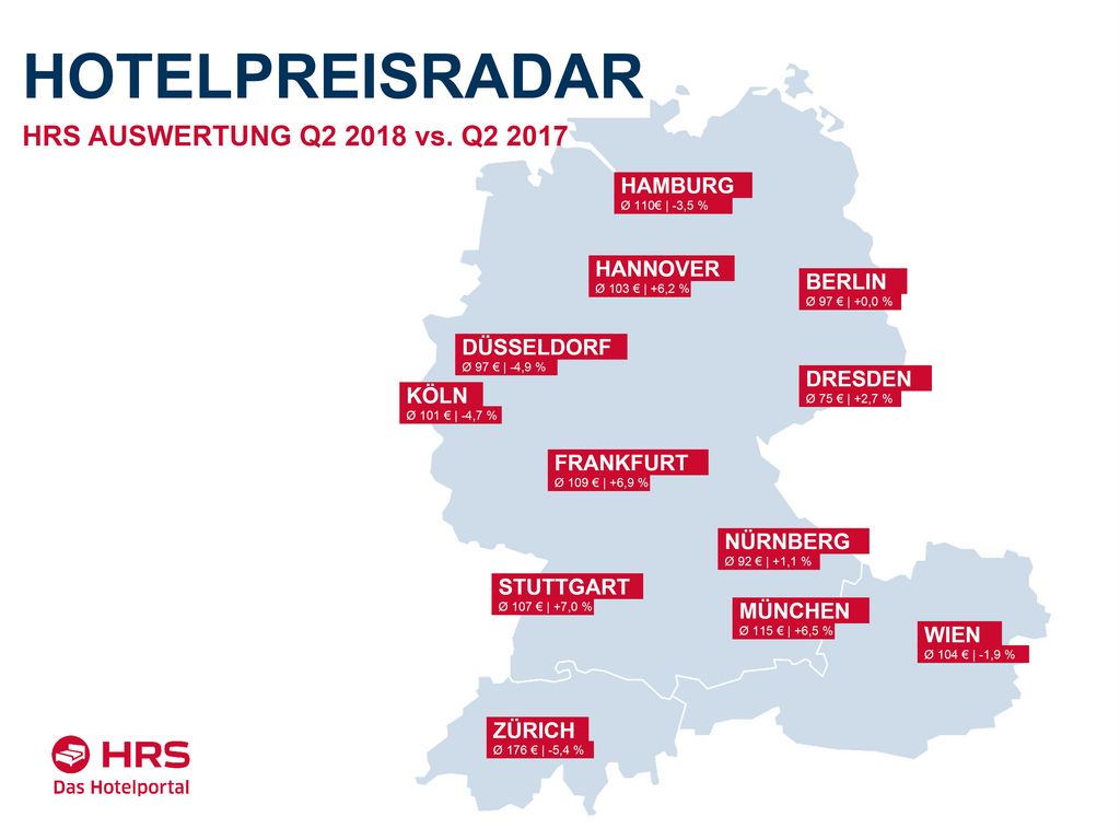 Die Hotelpreise in Deutschland haben sich im zweiten Quartal positiv entwickelt – die durchschnittlichen Übernachtungspreise lagen bei 91 Euro (Vorjahr 90 Euro). In den meisten deutschen Großstädten sind die Hotelpreise im Vergleich zum Vorjahr gestiegen. International gab es stellenweise größere Ausreißer, sagt HRS.