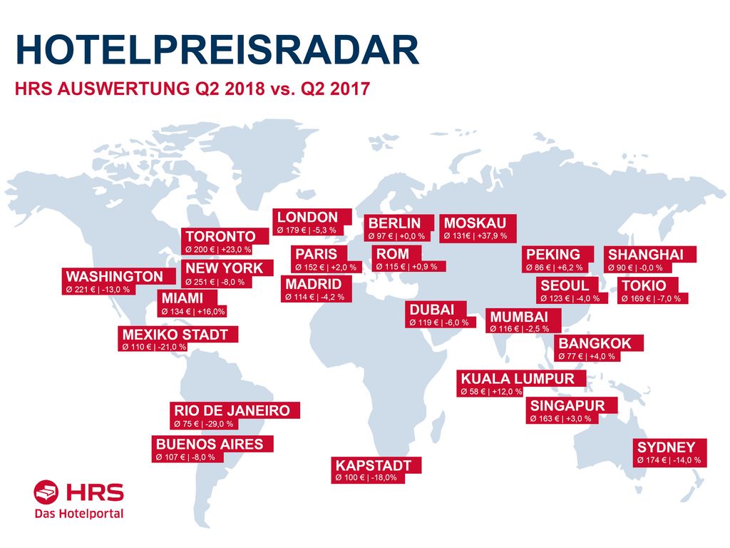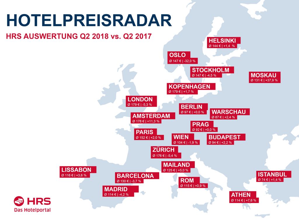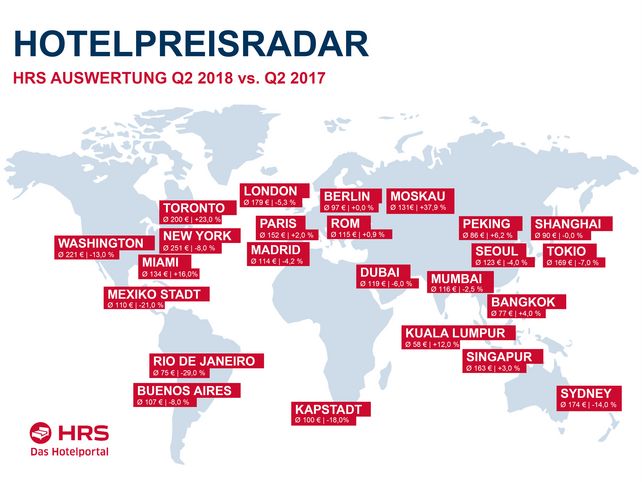 In den meisten europäischen Städten sind die Preise im zweiten Quartal im Vergleich zum Vorjahr stabil geblieben. Zu den Städten mit den höchsten Hotelpreisen zählen nach wie vor Kopenhagen (179 Euro), London (179 Euro), Amsterdam (178 Euro) und Zürich (176 Euro). Eine enorme Preissteigerung (+37,9 Prozent) ereignete sich in Moskau. Dort kostete die Nacht im zweiten Quartal im Schnitt 131 Euro (Vorjahreszeitraum: 95 Euro). Dazu beigetragen haben sicherlich die höheren Hotelpreise rund um die Fußball-Weltmeisterschaft und das WM-Eröffnungsspiel am 14. Juni. Einen Preisverfall von 31,9 Prozent seit dem letzten Jahr beobachtet HRS in Oslo. Der Grund dafür könnte der Zwei-Jahres-Rhythmus der international führenden Schifffahrts- und Offshore-Ausstellung „NOR-SHIPPING“ sein, die zuletzt Ende Mai 2017 stattfand und dann erst wieder im Jahr 2019.