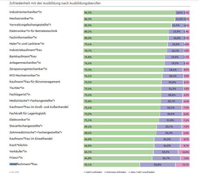 Bezogen auf das Gastgewerbe resümiert der Bericht, dass nur etwa zwei Drittel der Auszubildenden im Hotel- und Gaststättengewerbe sowie im Friseurhandwerk mit ihrer Ausbildung zufrieden sind. Insbesondere von den angehenden Hotelfachleuten ist nur gut die Hälfte mit ihrer Ausbildung zufrieden (53,1 Prozent). Dabei ist davon auszugehen, dass die Folgen der Corona-Pandemie und die damit verbundene temporäre Schließung vieler Betriebe einen besonders starken Einfluss auf die Ausbildungszufriedenheit haben dürfte.