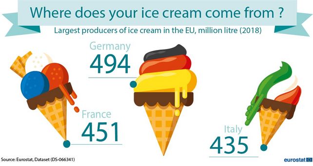 Deutschland war 2018 der größte Hersteller von Speiseeis in der EU (494 Millionen Liter oder 15,5 Prozent der Gesamtproduktion der EU28), gefolgt von Frankreich (451 Millionen oder 14,1 Prozent) und Italien (435 Millionen. oder 13,7 Prozent), sagt das Statistikamt der Union.
