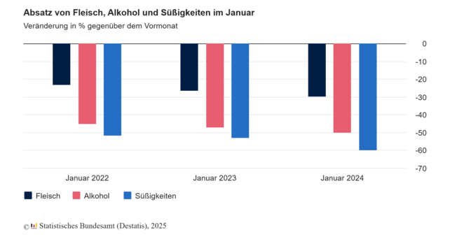 Im Januar 2024 wurde 49,7 Prozent weniger Alkohol gekauft als im Dezember 2023, wie das Statistische Bundesamt (Destatis) auf Basis von Scannerdaten aus dem Lebensmitteleinzelhandel mitteilt. Der Absatz von Fleisch ging im selben Zeitraum um 29,4 Prozent zurück. Gegenüber dem Jahresdurchschnitt 2023 fiel der Absatz von Alkohol im Januar 2024 um 32,0 Prozent geringer aus, der Absatz von Fleisch war 12,5 Prozent niedriger als im Jahresschnitt 2023.