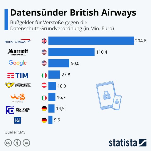 Wie Statista nun auf Basis von CMS-Daten ermittelt hat, sind die beiden größten Datensünder der Europäischen Union touristische Unternehmen. Auf dem ersten Platz landete die Fluglinie British Airways. Die Airline musste 2019 rund 205 Millionen Euro bezahlen - dies war die bislang höchste Individualstrafe. Grund dafür war, dass seit 2018 etwa eine halbe Million Personendaten weitergeleitet wurden.