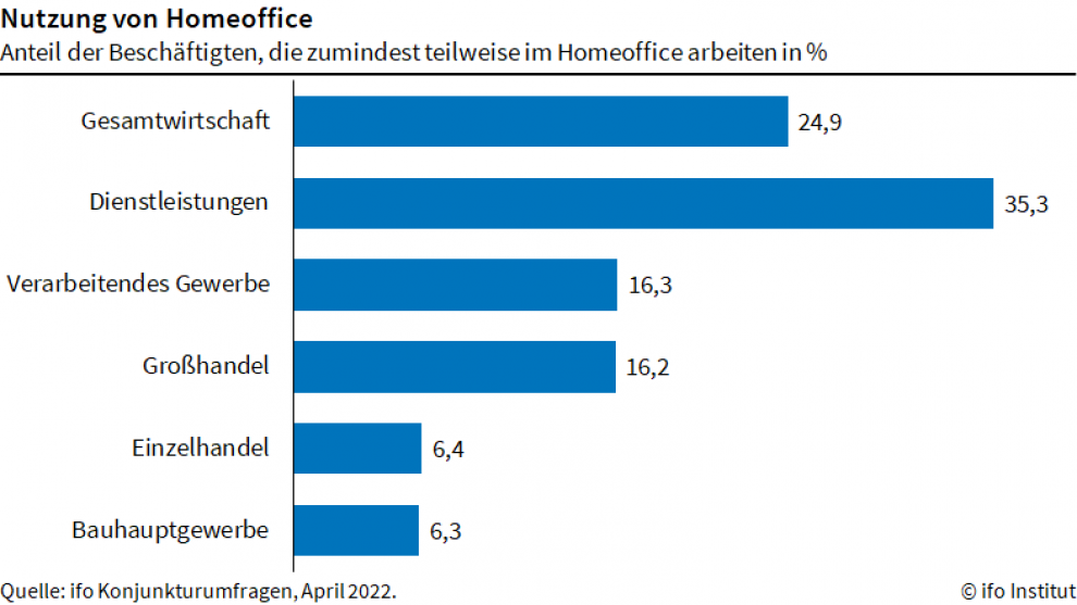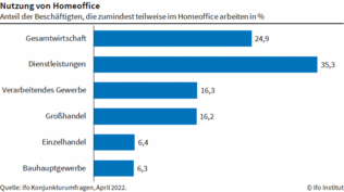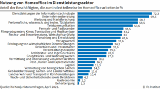 Im April waren es laut Ifo 35,3 Prozent, im März noch 38,7. In der IT-Branche ist bislang nur eine Minderheit der Arbeitnehmer in die Büros zurückgekehrt: Der Heimbüro-Anteil lag im April bei 72,3 Prozent, nach 76,8 Prozent im März.