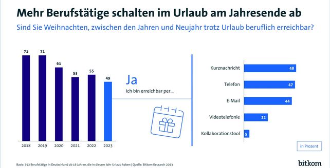 Das neue Buch lesen, Zeit mit der Familie verbringen oder einfach mal die Füße hochlegen: Zwischen den Jahren nutzen wieder mehr Deutsche ihre freien Tage, um tatsächlich abzuschalten. Unter den Berufstätigen, die in diesem Jahr in der Weihnachts- und Silvesterzeit frei haben, ist nur noch knapp die Hälfte (49 Prozent) trotz Urlaubs dienstlich erreichbar. Vor fünf Jahren waren es noch fast drei Viertel (2018: 71 Prozent).