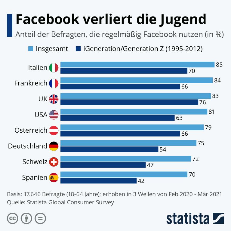 Zwar nutzen 75 Prozent der für den Statista Global Consumer Survey befragten Menschen in Deutschland Facebook. Aber bei den zwischen 1995 und 2012 geborenen schrumpft dieser Wert auf 54 Prozent. Auch in anderen Ländern sinkt der Anteil der Nutzer_innen unter Angehörigen von iGeneration beziehungsweise Generation Z deutlich, wie der Blick auf die Grafik zeigt.