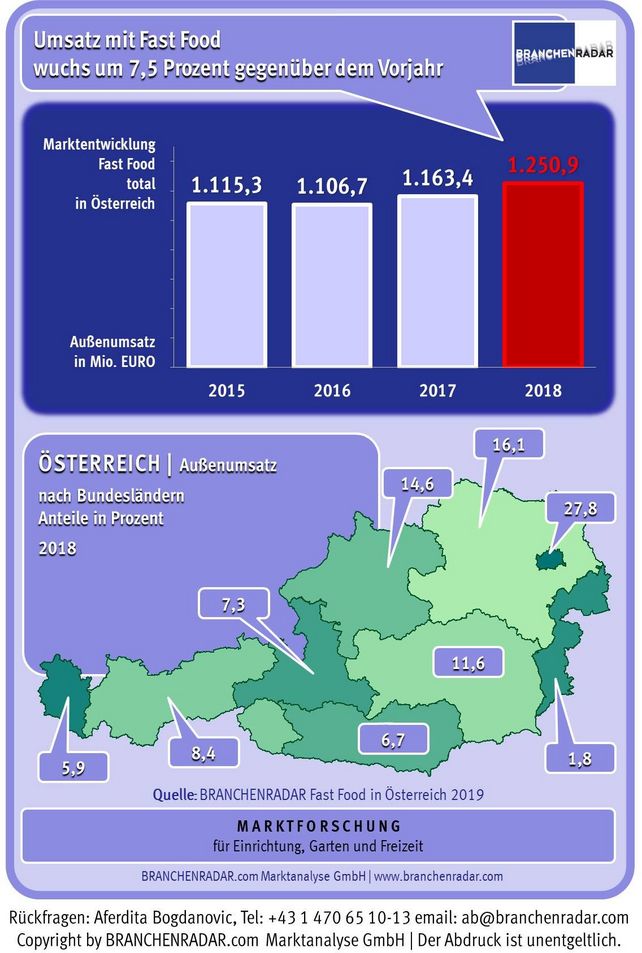 Das Geschäft mit Fast Food lief in Österreich im Jahr 2018 so gut wie schon lange nicht. Imbissstände geraten gegenüber der Systemgastronomie aber immer mehr in die Defensive, zeigen aktuelle Daten von Branchenradar.com.