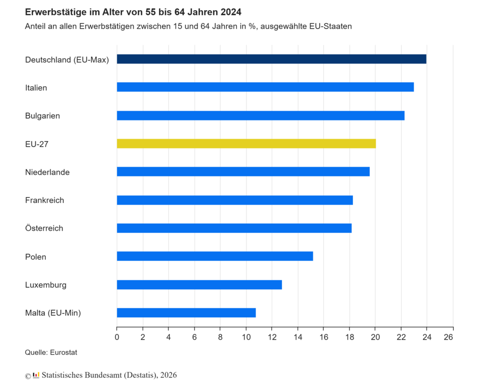 Die demografische Struktur des deutschen Arbeitsmarktes hebt sich deutlich vom europäischen Durchschnitt ab. Wie das Statistische Bundesamt (Destatis) mitteilt, gehört fast jeder vierte Erwerbstätige in Deutschland der Altersgruppe der 55- bis 64-Jährigen an. Mit einem Anteil von 24,0 Prozent belegt die Bundesrepublik damit den Spitzenplatz innerhalb der Europäischen Union.