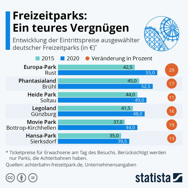 Der teuerste Park des Landes ist erneut der Europa-Park in Rust, in dem 55 Euro pro Person für den Eintritt fällig werden. 2015 lag der Preis noch bei 42,50 – ein Anstieg um 29 Prozent in fünf Jahren. Auf dem zweiten Platz landete bei der Auswertung das Phantasialand Brühl mit 52,50 Euro. Der dritte Platz im Preis-Ranking ging an den Heidepark Soltau mit 49 Euro.