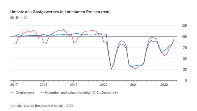 Der Umsatz im Gastgewerbe ist im Mai 2022 gegenüber April 2022 kalender- und saisonbereinigt real (preisbereinigt) um 8,5 Prozent und nominal (nicht preisbereinigt) um 9,8 Prozent gestiegen. Gegenüber dem Monat Mai 2021, als noch weitreichende Corona-Einschränkungen im Gastgewerbe galten, hat sich der reale Umsatz mehr als verdoppelt (+126,8 Prozent). Wie das Statistische Bundesamt (Destatis) nach vorläufigen Ergebnissen weiter mitteilt, lag der Gastgewerbeumsatz im Mai 2022 real noch 14,9 Prozent unter dem Niveau vom Februar 2020, dem Monat vor Ausbruch der Corona-Pandemie in Deutschland.