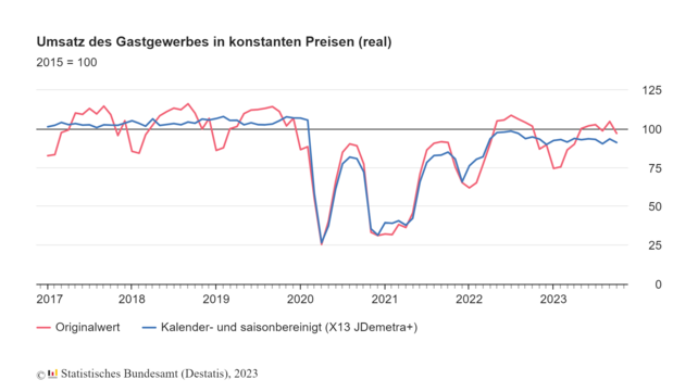 Die Hotels und sonstigen Beherbergungsunternehmen verzeichneten im Oktober 2023 gegenüber September 2023 ein reales kalender- und saisonbereinigtes Umsatzminus von 2,3 Prozent, womit der Umsatz 7,5 Prozent unter dem Vorkrisenniveau vom Oktober 2019 lag. In der Gastronomie sank der reale kalender- und saisonbereinigte Umsatz im Oktober 2023 im Vormonatsvergleich ebenfalls um 2,3 Prozent, er war damit 14,7 Prozent niedriger als im niedriger als im Oktober 2019.