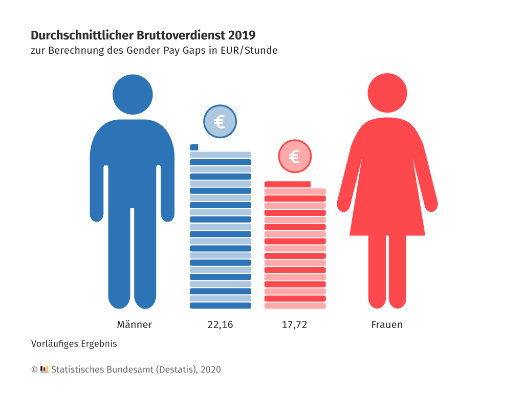 Frauen haben im Jahr 2019 in Deutschland 20 Prozent weniger verdient als Männer. Der Verdienstunterschied zwischen Frauen und Männern – der unbereinigte Gender Pay Gap – war damit um 1 Prozentpunkt geringer als in den Vorjahren. Wie das Statistische Bundesamt (Destatis) anlässlich des Equal Pay Day am 17. März 2020 anhand fortgeschriebener Ergebnisse der Verdienststrukturerhebung (VSE) mitteilt, verdienten Frauen mit durchschnittlich 17,72 Euro brutto in der Stunde 4,44 Euro weniger als Männer (22,16 Euro). 2018 hatte die Differenz 4,51 Euro betragen.