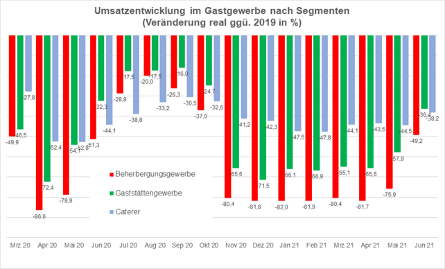 Das Statistische Bundesamt hat bekannt gegeben, dass der Umsatzrückgang im Gastgewerbe von Januar bis Juni nominal 35,6 Prozent und real 38,0 Prozent – und das im Vergleich zum Ausnahmejahr 2020 mit historischen Verlusten. Bezogen auf das Vorkrisenjahr 2019 verzeichnete das Gastgewerbe preisbereinigt sogar 62,3 Prozent weniger Umsatz.