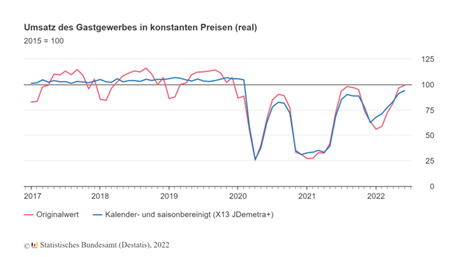Im Juni 2022 stiegen die Umsätze im Gastgewerbe kalender- und saisonbereinigt real um 3,1 Prozent und nominal um 4,0 Prozent gegenüber dem Vormonat. Im Vergleich zum Juni 2021 lag der Gastgewerbeumsatz im Juni 2022 um 36,9 Prozent und nominal um 45,7 Prozent höher, befand sich jedoch real noch 10,1 Prozent unter dem Niveau vom Februar 2020, dem Monat vor Ausbruch der Corona-Pandemie in Deutschland. Im Gegensatz dazu erreichten die nominalen Umsätze erstmalig seit Pandemiebeginn wieder das Vorkrisenniveau (+0,1 Prozent), was jedoch auf die deutlichen Preissteigerungen zurückzuführen ist.