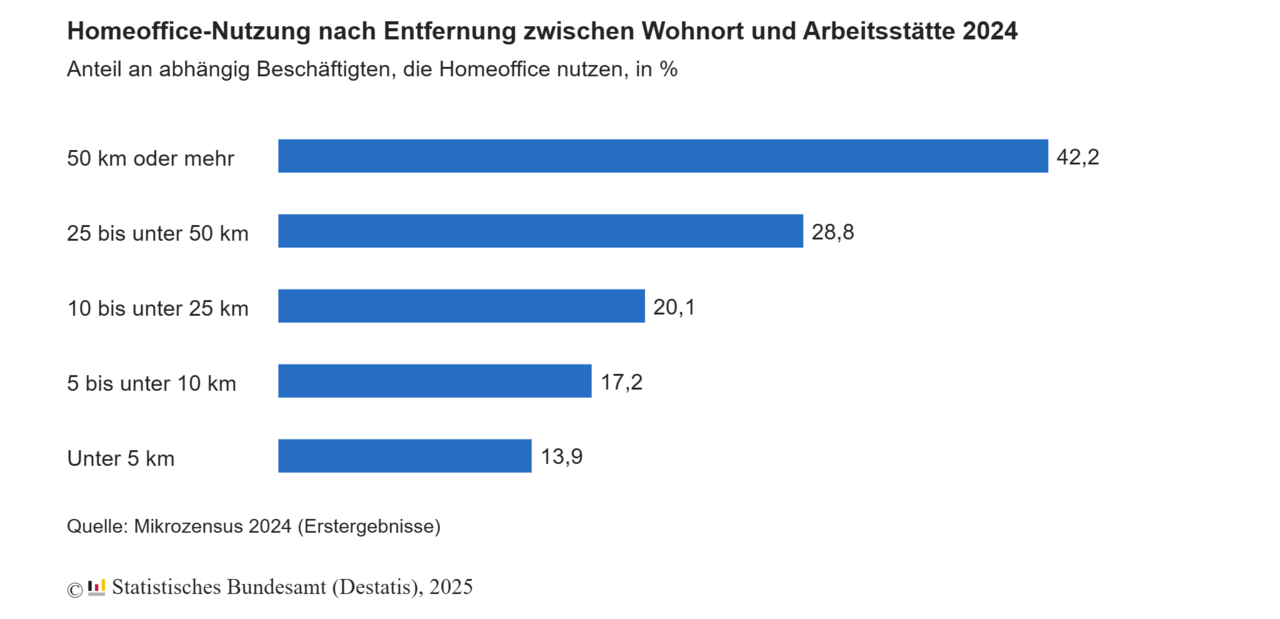 Die Statistiken zeigen, dass die Entfernung zwischen Wohnort und Arbeitsplatz eine wichtige Rolle bei der Homeoffice-Nutzung spielt. Bei einem Arbeitsweg von 50 Kilometern oder mehr arbeiteten im Jahr 2024 42 % der Beschäftigten im Homeoffice. Dieser Anteil hat seit 2020 um 8 Prozentpunkte zugenommen. Bei einer Distanz von 25 bis unter 50 Kilometern waren es 29 %. Der geringste Anteil (14 %) wurde bei Pendlern mit einem Arbeitsweg von weniger als 5 Kilometern verzeichnet.