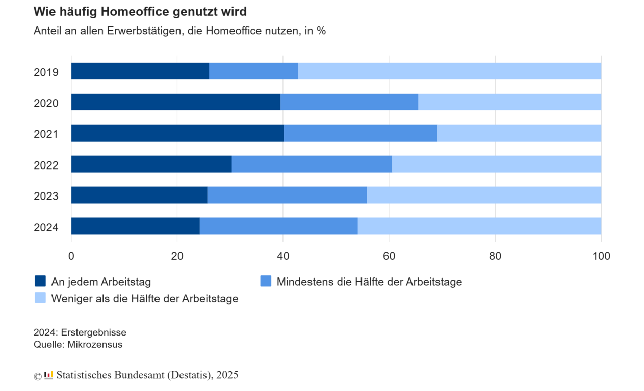 Trotz der weiterhin hohen Verbreitung wird das Homeoffice mittlerweile weniger intensiv genutzt. Im Jahr 2024 arbeiteten nur noch 24 % der Homeoffice-Nutzenden ausschließlich von zu Hause aus. Dieser Anteil ist im Vergleich zu 2023 (26 %) und insbesondere zum Höhepunkt der Pandemie 2021 (40 %) gesunken.
