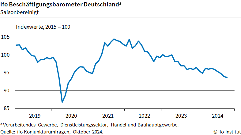 Die Unternehmen sind zurückhaltender bei der Personalplanung. Das ifo-Beschäftigungsbarometer sank im Oktober auf 93,7 Punkte, nach 94,0 Punkten im September. Das ist der niedrigste Wert seit Juli 2020.
