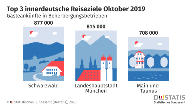 Der Großteil der rund 17,5 Millionen Gäste, die im Oktober 2019 in Deutschlands Beherbergungsbetrieben eincheckten, kam aus dem Inland (81 %). Von den rund 3,4 Millionen Gästen aus dem Ausland reisten die meisten aus der Schweiz (350.000), den Niederlanden (321.000) sowie den Vereinigten Staaten (288.000) an.